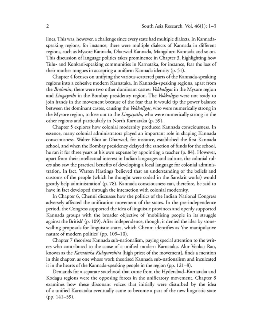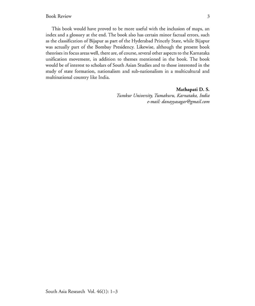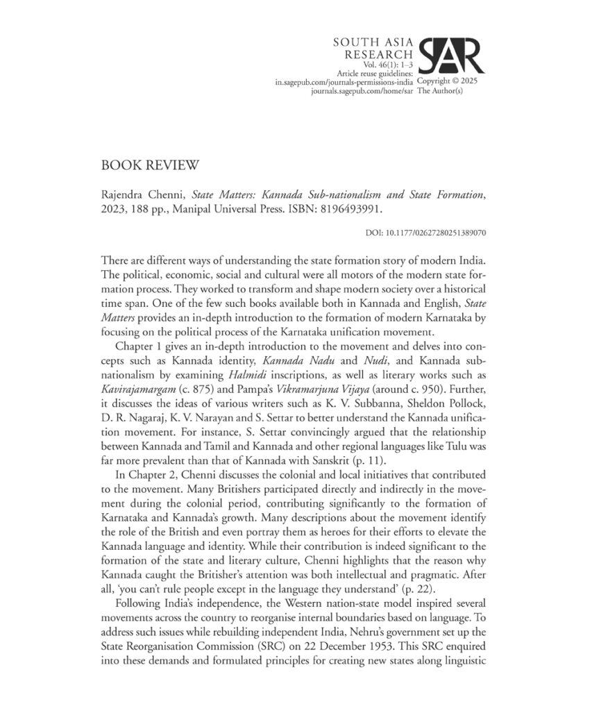 We are delighted to share that “State Matters: Kannada Sub-nationalism and State Formation” by Dr Rajendra Chenni has been featured in South Asia Research (Vol. 46(1): 1–3, 2025). Dr Mathapati D S offers an insightful review exploring the book’s rich study of Kannada identity and state formation.![]()